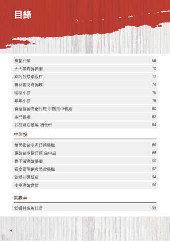 目錄 滿穗台菜 68 天天來海鮮餐廳 70 真的好京漾飯店 72 雲林鵝肉海鮮城 74 暖暖小館 76 年年小館 78 宜蘭傳藝老爺行旅 手路菜中餐廳 80 金門餐廳 82 兆品酒店礁溪 初食軒 84 中彰投 華美街台中担仔麵餐廳 86 頂鮮台南擔仔麵 台中店 88 梅子活海鮮餐廳 90 福宴國際創意美食餐廳 92 臻愛花園飯店 94 木生海鮮會館 96 雲嘉南 稻香村懷舊料理 98 4