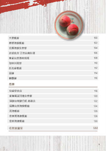 大眾餐廳 100 樺榮海鮮餐廳 102 玄饌海鮮宴會館 104 府城食府 正宗台南料理 106 東香台菜海味料理 108 知味料理館 110 新萬香餐廳 112 福樓 114 錦霞樓 116 高屏 仙香飲食店 118 香蕉碼頭河邊宴會館 120 頂鮮台南擔仔麵 高雄店 122 福園台菜海鮮餐廳 124 百海餐廳 126 忠東港海產餐廳 128 佳珍海產餐廳 130 名家說臺菜 132 5
