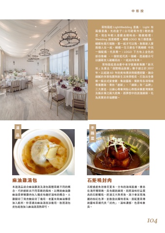 %u77f3%u9b94%u76db%u7522%u9b5a%u521d%u6625%u81f3%u590f%u672b%uff0c%u5206%u5e03%u7684%u6d77%u57df%u751a%u5ee3%uff0c%u68f2%u606f%u5728%u6dfa%u576a%u73ca%u745a%u7901%uff0c%u5177%u6709%u7db2%u72c0%u7d30%u6591%uff0c%u800c%u5c07%u6ecb%u5473%u597d%u54c1%u8cea%u9ad8%u7684%u77f3%u9b94%u66ec%u4e7e%uff0c%u7d93%u904e%u6587%u706b%u71ac%u716e%u5f8c%uff0c%u6e6f%u6c41%u6703%u5448%u73fe%u7470%u9e97%u7684%u68d5%u7d05%u8272%u6fa4%uff0c%u4e26%u6563%u767c%u51fa%u7368%u7279%u9999%u6c23%uff0c%u642d%u914d%u81fa%u83dc%u50b3%u7d71%u91ac%u5473%u83dc%u991a%u4ee3%u8868%u300c%u5c01%u8089%u300d%uff0c%u6ecb%u5473%u6fc3%u90c1%uff0c%u8272%u9999%u5473%u517c%u5177%u3002%u672c%u9053%u6e6f%u54c1%u7d50%u5408%u9ebb%u6cb9%u96de%u6e6f%u53ca%u6e6f%u5305%u5169%u7a2e%u83dc%u991a%u4e0d%u540c%u7684%u6982%u5ff5%uff0c%u5de7%u5999%u5275%u65b0%u51fa%u4e0d%u540c%u83dc%u991a%u7684%u98a8%u5473%uff0c%u4ee5%u50b3%u7d71%u9ebb%u6cb9%u96de%u9ebb%u6cb9%u9999%u9bae%u5ae9%u96de%u8089%u5305%u5165%u9eb5%u76ae%u6709%u8da3%u597d%u6ecb%u5473%u7684%u6982%u5ff5%u3002%u571f%u96de%u817f%u5207%u4e01%u8207%u674f%u9b91%u83c7%u5207%u4e01%u5099%u7528%uff0c%u8001%u8591%u672b%u8207%u9ebb%u6cb9%u7206%u9999%u52a0%u5165%u9921%u6599%uff0c%u7092%u9999%u6ffe%u51fa%u9ebb%u6cb9%u6e6f%u653e%u6dbc%u5099%u7528%uff0c%u5f8c%u5c07%u6e6f%u5305%u76ae%u5305%u8d77%u5f8c%u52a0%u5165%u9ebb%u6cb9%u6e6f%u84b8%u719f%u5373%u53ef%u3002 %u840a%u7279%u8587%u5ead LightWedding %u610f%u7fa9%uff1a Light %u6709%u5169%u500b%u610f%u7fa9%uff0c%u5149%u7684%u76d2%u5b50 ( %u516c%u53f8%u5efa%u7bc9%u5916%u578b ) %u8f15%u7684%u610f%u601d%uff0c%u73fe%u5728%u5e74%u8f15%u4eba%u559c%u6b61%u8d70%u8f15%u6642%u5c1a%u3001%u7cbe%u7dfb%u5a5a%u79ae%uff1bWedding %u5c31%u662f%u5a5a%u79ae%u3002 %u8774%u8776 LOGO %u6709%u4e09%u500b%u610f%u7fa9%uff1a %u8774%u8776%u6709%u5169%u7247%u7fc5%u8180%uff0c%u8981%u4e00%u8d77%u624d%u53ef%u4ee5%u98db%uff0c%u8c61%u5fb5%u65b0%u4eba%u8981%u5169%u500b%u4eba%u5728%u4e00%u8d77%uff0c%u8774%u8776%u4e00%u751f%u53ea%u6703%u5728%u5343%u842c%u8774%u8776 %u4e2d%u627e%u4e00%u500b%u914d%u5076%uff0c%u4ee3%u8868%u5c08%u4e00%uff1bLOGO %u4e0b%u65b9%u6709%u4e0a%u91d1%u8272%u7684%u90e8%u4efd%u50cf%u86f9 %uff0c%u4e00%u500b%u5bb6%u5ead%u4ee3%u8868%u4e00%u500b%u86f9%uff0c%u900f%u904e%u78e8%u5408%u53ef%u4ee5%u8b93%u5169%u5bb6%u4eba%u7834%u86f9%u800c%u51fa%uff0c%u4e00%u8d77%u8d70%u5411%u672a%u4f86%u3002 %u840a%u7279%u8587%u5ead%u662f%u7531%u81fa%u4e2d%u8001%u5b57%u865f%u9910%u98f2%u96c6%u5718%u300c%u65b0%u5929%u5730%u300d%u53ca%u81fa%u5317%u300c%u8587%u95a3%u7cbe%u54c1%u65c5%u9928%u300d%u806f%u624b%u5275%u7acb%u65bc 2017%u5e74%u3002%u4ee5%u8d85%u904e 60 %u5e74%u7684%u7f8e%u5473%u50b3%u627f%u8207%u5a5a%u79ae%u7d93%u9a57%uff0c%u878d%u5408%u7d30%u81a9%u7684%u4f11%u61a9%u6c1b%u570d%u8207%u65b0%u751f%u6d3b%u7f8e%u5b78%u614b%u5ea6%uff0c%u6253%u9020%u51fa%u5168%u81fa%u552f%u4e00%u98ef%u5e97%u5f0f%u5bb4%u6703%u5ef3%uff0c%u96c6%u7d50%u85dd%u8853%u3001%u9910%u98f2%u7b49%u5404%u9805%u9818%u57df%u5c08%u696d%u5718%u968a%uff0c%u79c9%u6301%u300c%u5275%u65b0%u300d%u3001%u300c%u7d30%u7bc0%u300d%u548c%u300c%u54c1%u724c%u300d%u4e09%u5927%u50f9%u503c%uff0c%u4ee5%u7d30%u5fc3%u5c08%u696d%u8207%u8cbc%u5fc3%u71b1%u60c5%u627f%u8972%u81fa%u7063%u9910%u98f2%u53ca%u98ef%u5e97%u696d%u4e4b%u5169%u5927%u7d93%u5178%uff0c%u5c07%u5922%u60f3%u4e2d%u7684%u6d6a%u6f2b%u7d30%u7bc0%uff0c%u5316%u70ba%u771f%u5be6%u7684%u5e78%u798f%u9ad4%u9a57%u3002%u9ebb%u6cb9%u96de%u6e6f%u5305 %u77f3%u9b94%u66c9%u5c01%u8089%u4e2d%u5f70%u6295%u6e6f%u624b%u8def%u83dc%u54c1104