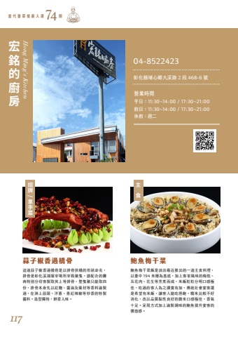 %u9b91%u9b5a%u6885%u5e72%u83dc%u98ef%u662f%u8a72%u5e97%u6700%u8fd1%u63a8%u51fa%u7684%u4e00%u9053%u4e3b%u98df%u6599%u7406%uff0c%u4ee5%u81fa%u4e2d 194 %u7c73%u7a2e%u70ba%u57fa%u5e95%uff0c%u52a0%u4e0a%u5ba2%u5bb6%u98a8%u5473%u7684%u6885%u4e7e%u3001%u4e94%u82b1%u8089%u3001%u82b1%u751f%u7b49%u70f9%u716e%u800c%u6210%uff0c%u7c73%u98ef%u7c92%u7c92%u5206%u660e%u53e3%u611f%u6975%u4f73%uff0c%u5403%u904e%u7684%u5ba2%u4eba%u70ba%u4e4b%u8b9a%u8cde%u6709%u52a0%uff0c%u50b3%u7d71%u793e%u6703%u5bb4%u5ba2%u9084%u662f%u5e0c%u671b%u6709%u7c73%u98ef%uff0c%u8b93%u5ba2%u4eba%u80fd%u5403%u5f97%u98fd%uff0c%u7cef%u7c73%u6bd4%u8f03%u4e0d%u597d%u6d88%u5316%uff0c%u6539%u4ee5%u54c1%u8cea%u9ecf%u6027%u826f%u597d%u7684%u99a5%u7c73%u53e3%u611f%u6975%u4f73%uff0c%u9999%u6c23%u5341%u8db3%u3002%u5448%u73fe%u65b9%u5f0f%u52a0%u4e0a%u6ef7%u88fd%u8abf%u5473%u7684%u9b91%u9b5a%u63d0%u5347%u5bb4%u5ba2%u7684%u50f9%u503c%u611f%u3002%u9019%u9053%u849c%u5b50%u6912%u9999%u904e%u6a4b%u9aa8%u662f%u4ee5%u6392%u9aa8%u62f1%u6a4b%u7684%u5f62%u72c0%u547d%u540d%uff0c%u6392%u9aa8%u662f%u5f70%u5316%u6eaa%u6e56%u5c60%u5bb0%u5834%u6240%u5bb0%u6bba%u8c6c%u96bb%uff0c%u8acb%u914d%u5408%u7684%u6524%u5546%u7279%u5225%u5206%u5207%u5ba2%u88fd%u53d6%u5176%u4e0a%u7b49%u6392%u9aa8%uff0c%u6574%u96bb%u8c6c%u53ea%u80fd%u53d6%u56db%u4efd%uff0c%u6392%u9aa8%u672c%u8eab%u5148%u4ee5%u7d05%u9eb4%u3001%u91ac%u6cb9%u53ca%u85e5%u6750%u7b49%u9999%u6599%u6ef7%u88fd%u904e%uff0c%u5728%u6dcb%u4e0a%u849c%u982d%u3001%u6d0b%u8525%u3001%u9752%u7d05%u8fa3%u6912%u7b49%u7092%u9999%u7684%u7279%u88fd%u91ac%u6599%u3002%u9020%u578b%u7368%u7279%uff0c%u9bae%u9999%u5165%u5473%u3002%u849c%u5b50%u6912%u9999%u904e%u6a4b%u9aa8 %u9b91%u9b5a%u6885%u5e72%u83dc Hong Ming's Kitchen%u62db%u724c/%u62ff%u624b%u83dc%u4e3b%u98df%u5b8f%u9298%u7684%u5eda%u623f%u7576 %u4ee3 %u81fa %u83dc %u9910 %u5ef3 %u5165 %u9078 %u959304-8522423%u71df%u696d%u6642%u9593%u4f11%u5047%uff1a%u9031%u4e8c%u5047%u65e5%uff1a11:30~14:00 / 17:30~21:00%u5f70%u5316%u7e23%u57d4%u5fc3%u9109%u5927%u6eaa%u8def 2 %u6bb5 468-6 %u865f74%u5e73%u65e5%uff1a11:30~14:00 / 17:30~21:00117