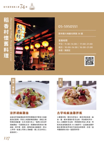 %u571f%u96de%u817f%u5207%u584a%uff0c%u7cef%u7c73%u6d17%u6de8%u6ce1%u6c34%uff0c%u8766%u7c73%u9999%u83c7%u6ce1%u767c%uff0c%u9ebb%u6cb9%u3001%u8591%u3001%u8766%u7c73%u6162%u6162%u7092%u9999%u81f3%u91d1%u9ec3%uff0c%u518d%u52a0%u7cef%u7c73%u62cc%u7092%uff0c%u52a0%u4e0a%u571f%u96de%u817f%u7092%u81f3%u91d1%u9ec3%uff0c%u518d%u5c07%u8abf%u5473%u6599%u52a0%u5165%u716e%u6efe%uff0c%u518d%u5c07%u5176%u653e%u9032%u96fb%u934b%u84b8%u716e 20 %u5206%u9418%u5373%u53ef%u3002%u9019%u9053%u9ebb%u6cb9%u96de%u62cc%u98ef%u5728%u81fa%u83dc%u98f2%u98df%u754c%u5730%u4f4d%u53ef%u8aaa%u662f%u9ad8%u6df1%u83ab%u6e2c%uff0c%u4ea6%u662f%u4e00%u9053%u8003%u9a57%u5eda%u5e2b%u529f%u592b%u7684%u4e00%u9053%u81fa%u83dc%u6599%u7406%u3002%u9019%u9053%u6dbc%u62cc%u80e1%u9ebb%u96de%u7d72%u662f%u7528%u5c4f%u6771%u7a2e%u690d%u7684%u6d0b%u8525%u548c%u6597%u5357%u76db%u7522%u7684%u7d05%u863f%u8514%uff0c%u518d%u642d%u4e0a%u8089%u8cea%u9bae%u5ae9%u7684%u96de%u7d72%uff0c%u642d%u914d%u4e3b%u5eda%u7279%u88fd%u7684%u80e1%u9ebb%u91ac%uff0c%u5728%u708e%u708e%u590f%u65e5%u4f86%u4e0a%u4e00%u76e4%u723d%u53e3%u7684%u6dbc%u62cc%u80e1%u9ebb%u96de%u7d72%uff0c%u53ef%u8b02%u6691%u6c23%u5168%u6d88%u3002%u5c07%u96de%u80f8%u8089%u60b6%u716e%u5f8c%u624b%u6495%u6210%u7d72%uff0c%u5c07%u6d0b%u8525%u3001%u860b%u679c%u3001%u863f%u8514%u5207%u7d72%u51b0%u93ae%u5099%u7528%uff0c%u5c07%u4ee5%u4e0a%u62cc%u518d%u4e00%u8d77%u76db%u4e0a%u518d%u6dcb%u4e0a%u80e1%u9ebb%u91ac%uff0c%u6492%u4e0a%u82b1%u751f%u788e%u653e%u4e0a%u9999%u83dc%u5373%u53ef%u3002%u6dbc%u62cc%u80e1%u9ebb%u96de%u7d72 %u53e4%u65e9%u5473%u9ebb%u6cb9%u96de%u62cc%u98ef Daoxiang Village Nostalgic Cuisine%u62db%u724c/%u62ff%u624b%u83dc%u4e3b%u98df%u7a3b%u9999%u6751%u61f7%u820a%u6599%u7406%u7576 %u4ee3 %u81fa %u83dc %u9910 %u5ef3 %u5165 %u9078 %u959305-5950551%u71df%u696d%u6642%u9593%u4f11%u5047%uff1a%u7121%u56fa%u5b9a%u5047%u65e5%uff1a10:00~14:00 / 16:00~21:00%u96f2%u6797%u7e23%u6597%u5357%u93ae%u5149%u83ef%u8def 36 %u865f74%u5e73%u65e5%uff1a11:30~14:00 / 17:00~21:00127