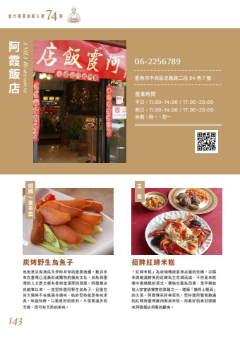 %u300c%u7d05%u87f3%u7c73%u7cd5%u300d%u70ba%u5e9c%u57ce%u50b3%u7d71%u5bb4%u5e2d%u5fc5%u5099%u7684%u4f73%u991a%uff0c%u4ee5%u7cef%u7c73%u8207%u98fd%u6eff%u9bae%u7f8e%u7684%u7d05%u87f3%u70ba%u4e3b%u70f9%u8abf%u800c%u6210%uff0c%u4e0d%u4f46%u662f%u7c73%u7cd5%u985e%u4e2d%u6700%u7cbe%u7dfb%u7684%u83dc%u5f0f%uff0c%u50f9%u683c%u4e5f%u6700%u70ba%u6602%u8cb4%uff0c%u662f%u65e9%u671f%u5bcc%u88d5%u4eba%u5bb6%u5bb4%u8acb%u8cd3%u5ba2%u7684%u83dc%u991a%u4e4b%u4e00%uff0c%u582a%u7a31%u300c%u642c%u5f97%u4e0a%u6aaf%u9762%u300d%u7684%u5927%u83dc%u3002%u963f%u971e%u50b3%u627f%u7d93%u5178%u83dc%u8272%uff0c%u5805%u6301%u9078%u7528%u87f9%u9ec3%u98fd%u6eff%u7684%u7d05%u87f3%u8207%u81fa%u7063%u8c6c%u8089%u88fd%u6210%u7c73%u7cd5%uff0c%u7528%u6700%u597d%u7684%u98df%u6750%u611f%u8b1d%u4f86%u963f%u971e%u98ef%u5e97%u7528%u9910%u7684%u9867%u5ba2%u3002%u70cf%u9b5a%u662f%u6cbf%u6d77%u6f01%u6c11%u51ac%u5b63%u6642%u975e%u5e38%u7684%u91cd%u8981%u6f01%u7372%uff0c%u6578%u767e%u5e74%u4f86%u5728%u81fa%u7063%u5df2%u9010%u6f38%u5f62%u6210%u7368%u7279%u7684%u6355%u70cf%u6587%u5316%uff0c%u70cf%u9b5a%u548c%u81fa%u7063%u7684%u4eba%u6587%u6b77%u53f2%u90fd%u6709%u8457%u76f8%u7576%u6df1%u539a%u7684%u6df5%u6e90%u3002%u963f%u971e%u98ef%u5e97%u81ea%u5275%u696d%u4ee5%u4f86%uff0c%u4e00%u76f4%u5805%u6301%u9078%u7528%u91ce%u751f%u70cf%u9b5a%u5b50%uff0c%u4e14%u50c5%u5728%u70ad%u706b%u71d2%u70e4%u4e0d%u5728%u505a%u904e%u591a%u8abf%u5473%uff0c%u59cb%u7d42%u5805%u6301%u5c31%u662f%u7f8e%u5473%u6c42%u771f%uff0c%u5473%u80fd%u77e5%u9bae%uff0c%u53ea%u8981%u662f%u597d%u7684%u539f%u6599%uff0c%u4e0d%u9700%u8981%u904e%u591a%u7684%u70f9%u8abf%uff0c%u5373%u53ef%u6709%u5929%u7136%u7684%u7f8e%u5473%u3002%u70ad%u70e4%u91ce%u751f%u70cf%u9b5a%u5b50 %u62db%u724c%u7d05%u87f3%u7c73%u7cd5 A SHA Restaurant%u62db%u724c/%u62ff%u624b%u83dc%u4e3b%u98df%u963f%u971e%u98ef%u5e97%u7576 %u4ee3 %u81fa %u83dc %u9910 %u5ef3 %u5165 %u9078 %u9593 7406-2256789%u71df%u696d%u6642%u9593%u4f11%u5047%uff1a%u5468%u4e00%u3001%u521d%u4e00%u5047%u65e5%uff1a11:00~14:00 / 17:00~20:00%u81fa%u5357%u5e02%u4e2d%u897f%u5340%u5fe0%u7fa9%u8def%u4e8c%u6bb5 84 %u5df7 7 %u865f%u5e73%u65e5%uff1a11:00~14:00 / 17:00~20:00143