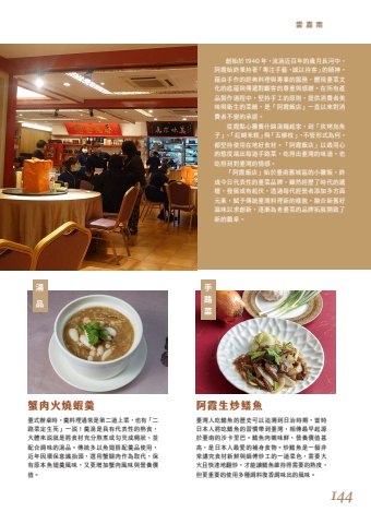 %u81fa%u7063%u4eba%u5403%u9c54%u9b5a%u7684%u6b77%u53f2%u53ef%u4ee5%u8ffd%u6eaf%u5230%u65e5%u6cbb%u6642%u671f%uff0c%u7576%u6642%u65e5%u672c%u4eba%u5c07%u5403%u9c54%u9b5a%u7684%u7fd2%u6163%u5e36%u5230%u81fa%u7063%uff0c%u76f8%u50b3%u6700%u65e9%u8d77%u6e90%u65bc%u81fa%u5357%u7684%u6c99%u5361%u91cc%u5df4%u3002%u9c54%u9b5a%u8089%u5ae9%u5473%u9bae%uff0c%u71df%u990a%u50f9%u503c%u751a%u9ad8%uff0c%u662f%u65e5%u672c%u4eba%u6700%u611b%u7684%u88dc%u8eab%u98df%u7269%u3002%u7092%u9c54%u9b5a%u662f%u4e00%u500b%u975e%u5e38%u8b1b%u7a76%u98df%u6750%u65b0%u9bae%u8207%u5e2b%u5085%u7092%u5de5%u7684%u4e00%u9053%u83dc%u8272%uff0c%u9700%u8981%u5927%u706b%u4e14%u5feb%u901f%u5730%u7ffb%u7092%uff0c%u624d%u80fd%u8b93%u9c54%u9b5a%u7dad%u6301%u5f97%u9700%u8981%u7684%u719f%u5ea6%uff0c%u4f46%u66f4%u91cd%u8981%u7684%u4f7f%u7528%u591a%u7a2e%u8abf%u6599%u5fa9%u9999%u8abf%u5473%u51fa%u7684%u98a8%u5473%u3002%u81fa%u5f0f%u8fa6%u684c%u6642%uff0c%u7fb9%u6599%u7406%u901a%u5e38%u662f%u7b2c%u4e8c%u9053%u4e0a%u83dc%uff0c%u4e5f%u6709%u300c%u4e8c%u8def%u83dc%u5b9a%u751f%u6b7b%u300d%u4e00%u8aaa%uff01%u7fb9%u6e6f%u662f%u5177%u6709%u4ee3%u8868%u6027%u7684%u71b1%u98df%uff0c%u5927%u9ad4%u4f86%u8aaa%u5c31%u662f%u5c07%u98df%u6750%u5145%u5206%u71ac%u716e%u6216%u52fe%u82a1%u6210%u7a20%u72c0%u3001%u4e26%u914d%u5408%u8abf%u5473%u7684%u6e6f%u54c1%u3002%u50b3%u7d71%u591a%u4ee5%u9b5a%u7fc5%u642d%u914d%u7fb9%u54c1%u4f7f%u7528%uff0c%u8fd1%u5e74%u56e0%u74b0%u4fdd%u610f%u8b58%u62ac%u982d%uff0c%u9078%u7528%u87f9%u817f%u8089%u4f5c%u70ba%u53d6%u4ee3%uff0c%u4fdd%u6709%u539f%u672c%u9b5a%u7fc5%u7fb9%u98a8%u5473%uff0c%u53c8%u66f4%u589e%u52a0%u87f9%u8089%u98a8%u5473%u8207%u71df%u990a%u50f9%u503c%u3002 %u5275%u59cb%u65bc 1940%u5e74%uff0c%u6d41%u6dcc%u8fd1%u767e%u5e74%u7684%u6b72%u6708%u9577%u6cb3%u4e2d%uff0c%u963f%u971e%u59cb%u7d42%u79c9%u6301%u8457%u300c%u5c08%u6ce8%u624b%u85dd%uff0c%u8aa0%u4ee5%u5f85%u5ba2%u300d%u7684%u7cbe%u795e%uff0c%u85c9%u7531%u624b%u4f5c%u7684%u7d93%u5178%u6599%u7406%u8207%u5c08%u696d%u7684%u670d%u52d9%uff0c%u9ad4%u73fe%u81fa%u83dc%u6587%u5316%u7684%u5e95%u860a%u8207%u50b3%u905e%u5c0d%u9867%u5ba2%u7684%u5c0a%u91cd%u8207%u611f%u8b1d%u3002%u5728%u6240%u6709%u7522%u54c1%u88fd%u4f5c%u904e%u7a0b%u4e2d%uff0c%u5805%u6301%u624b%u5de5%u7684%u539f%u5247%uff0c%u63d0%u4f9b%u6d88%u8cbb%u8005%u7f8e%u5473%u8207%u885b%u751f%u7684%u83dc%u991a%uff0c%u662f%u300c%u963f%u971e%u98ef%u5e97%u300d%u4e00%u76f4%u4ee5%u4f86%u5c0d%u6d88%u8cbb%u8005%u4e0d%u8b8a%u7684%u627f%u8afe%u3002 %u5f9e%u971e%u9ede%u5fc3%u6524%u8ce3%u4ec0%u9326%u6e6f%u9eb5%u8d77%u5bb6%uff0c%u5230%u300c%u70ad%u70e4%u70cf%u9b5a%u5b50%u300d%u3001%u300c%u7d05%u87f3%u7c73%u7cd5%u300d%u8207%u300c%u4e94%u67f3%u679d%u300d%uff0c%u4e0d%u7ba1%u5f62%u5f0f%u70ba%u4f55%uff0c%u90fd%u5805%u6301%u4f7f%u7528%u5728%u5730%u597d%u98df%u6750%u3002%u300c%u963f%u971e%u98ef%u5e97%u300d%u4ee5%u6700%u7528%u5fc3%u7684%u614b%u5ea6%u7aef%u51fa%u6bcf%u9053%u624b%u8def%u83dc%uff0c%u5403%u5f97%u51fa%u81fa%u7063%u7684%u5473%u9053%uff0c%u4e5f%u5403%u5f97%u5230%u5c0d%u81fa%u7063%u7684%u60c5%u611f%u3002 %u300c%u963f%u971e%u98ef%u5e97%u300d%u59cb%u65bc%u81fa%u5357%u820a%u57ce%u5340%u7684%u5c0f%u6524%u8ca9%uff0c%u7d42%u6210%u4eca%u65e5%u4ee3%u8868%u6027%u7684%u81fa%u83dc%u54c1%u724c%uff0c%u96d6%u7136%u7d93%u6b77%u4e86%u6642%u4ee3%u7684%u905e%u5b17%uff0c%u767c%u5c55%u6216%u6709%u8d77%u4f0f%uff0c%u900f%u904e%u6bcf%u4ee3%u7d93%u71df%u8005%u6dfb%u52a0%u591a%u65b9%u9762%u5143%u7d20%uff0c%u8ce6%u4e88%u50b3%u7d71%u81fa%u7063%u6599%u7406%u65b0%u7684%u6a23%u8c8c%uff0c%u878d%u5408%u65b0%u820a%u597d%u6ecb%u5473%u4ee5%u6c42%u5275%u65b0%uff0c%u9010%u6f38%u70ba%u8001%u81fa%u83dc%u7684%u54c1%u724c%u62d3%u5c55%u958b%u555f%u4e86%u65b0%u7684%u7bc7%u7ae0%u3002%u87f9%u8089%u706b%u71d2%u8766%u7fb9 %u963f%u971e%u751f%u7092%u9c54%u9b5a%u96f2%u5609%u5357%u6e6f%u624b%u8def%u83dc%u54c1144