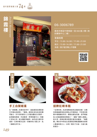 %u300c%u7d05%u87f3%u7c73%u7cd5%u300d%u70ba%u5e9c%u57ce%u50b3%u7d71%u5bb4%u5e2d%u5fc5%u5099%u7684%u4f73%u991a%uff0c%u4ee5%u7cef%u7c73%u8207%u98fd%u6eff%u9bae%u7f8e%u7684%u7d05%u87f3%u70ba%u4e3b%u70f9%u8abf%u800c%u6210%uff0c%u4e0d%u4f46%u662f%u7c73%u7cd5%u985e%u4e2d%u6700%u7cbe%u7dfb%u7684%u83dc%u5f0f%uff0c%u50f9%u683c%u4e5f%u6700%u70ba%u6602%u8cb4%uff0c%u662f%u65e9%u671f%u5bcc%u88d5%u4eba%u5bb6%u5bb4%u8acb%u8cd3%u5ba2%u7684%u83dc%u991a%u4e4b%u4e00%uff0c%u582a%u7a31%u300c%u642c%u5f97%u4e0a%u6aaf%u9762%u300d%u7684%u5927%u83dc%uff0c%u7d93%u5178%u7d05%u87f3%u7c73%u7cd5%u770b%u4efd%u91cf%u6c7a%u5b9a%u76e4%u98fe%uff0c%u300c%u9326%u971e%u6a13%u300d%u50b3%u627f%u591a%u5e74%u7279%u8272%u53ca%u662f%u8981%u5c07%u7d05%u87f3%u98fd%u6eff%u87f9%u818f%u5168%u90e8%u671d%u4e0a%u64fa%u6eff%u7c73%u7cd5%u4e4b%u4e0a%uff0c%u5448%u73fe%u4e00%u7a2e%u591a%u5b50%u591a%u5b6b%uff0c%u5927%u5bcc%u5927%u8cb4%u7684%u610f%u5ff5%u3002%u5728%u300c%u9326%u971e%u6a13%u300d%u7684%u81fa%u83dc%u7cfb%u5217%u4e2d%uff0c%u9053%u9053%u90fd%u662f%u9577%u671f%u71df%u904b%u4e2d%u6dec%u7149%u51fa%u7684%u7d93%u5178%u3002%u300c%u8766%u68d7%u300d%u90fd%u662f%u5404%u5bb6%u6709%u5404%u5bb6%u7684%u7368%u9580%u79d8%u65b9%uff0c%u81f3%u4eca%u4ecd%u7136%u4f7f%u7528%u4eba%u5de5%u624b%u6372%u5305%u8986%u7684%u65b9%u5f0f%u88fd%u4f5c%uff0c%u6b64%u83dc%u8766%u8089%u9bae%u751c%uff0c%u5916%u76ae%u9165%u9999%uff0c%u8378%u85ba%u723d%u8106%u53ef%u53e3%u3002%u7528%u8766%u4ec1%u6ce5%u70ba%u4e3b%u6599%uff0c%u914d%u4ee5%u9eb5%u7c89%u7b49%u8f14%u6599%uff0c%u6cb9%u70b8%u6210%u5927%u68d7%u5f62%u800c%u6210%u7684%u3002%u5b83%u8207%u70b8%u8766%u4e38%u8fd1%u4f3c%uff0c%u4f46%u8f14%u6599%u6709%u516b%u7a2e%u4e4b%u591a%uff0c%u70ba%u4e00%u822c%u8766%u4e38%u6240%u4e0d%u53ca%u3002%u624b%u5de5%u81ea%u88fd%u8766%u68d7 %u62db%u724c%u7d05%u87f3%u7c73%u7cd5 JinXia Restaurant%u62db%u724c/%u62ff%u624b%u83dc%u4e3b%u98df%u9326%u971e%u6a13%u7576 %u4ee3 %u81fa %u83dc %u9910 %u5ef3 %u5165 %u9078 %u9593 7406-3006789%u71df%u696d%u6642%u9593%u4f11%u5047%uff1a%u9664%u5915%u7576%u65e5%u665a%u4e0a%u4e0d%u71df%u696d%u5047%u65e5%uff1a11:00~14:00 / 17:00~21:00%u81fa%u5357%u5e02%u6771%u5340%u4e2d%u83ef%u6771%u8def%u4e00%u6bb5 366 %u865f 2 %u6a13%uff08%u5357%u7d21%u8cfc%u7269%u4e2d%u5fc3%u4e8c%u6a13%uff09%u5e73%u65e5%uff1a11:00~14:00 / 17:00~21:00149