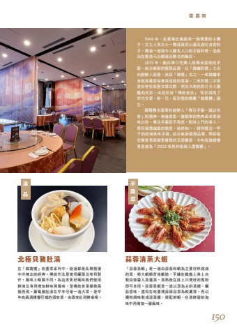 %u300c%u849c%u84c9%u84b8%u8766%u300d%u662f%u4e00%u9053%u7531%u849c%u84c9%u548c%u8766%u70ba%u4e3b%u8981%u6750%u6599%u505a%u6210%u7684%u83dc%uff0c%u5c07%u5927%u8766%u9817%u80cc%u5f8c%u65b7%u7b4b%uff0c%u5e73%u8216%u5728%u9435%u76e4%u4e0a%u6dcb%u4e0a%u81ea%u88fd%u849c%u84c9%u91ac%u5165%u84b8%u7c60%u84b8%uff0c%u84b8%u719f%u5f8c%u5728%u653e%u4e0a%u5ddd%u71d9%u597d%u7684%u5bec%u7c89%u5373%u53ef%u4eab%u7528%u3002%u849c%u84c9%u84b8%u8766%u662f%u4e00%u9053%u4ee5%u84b8%u70ba%u4e3b%u7684%u83dc%u991a%uff0c%u5c6c%u849c%u9999%u5473%uff0c%u9078%u7528%u5728%u5730%u81fa%u7063%u849c%u982d%u849c%u9999%u70ba%u8f03%u6fc3%u539a%uff0c%u518d%u4ee5%u7368%u7279%u8abf%u5473%u88fd%u6210%u849c%u84c9%u91ac%uff0c%u642d%u914d%u9bae%u8766%uff0c%u5728%u6e05%u9bae%u751c%u7684%u6d77%u5473%u4e2d%u518d%u589e%u52a0%u4e00%u5c64%u98a8%u5473%u3002%u5728%u300c%u9326%u971e%u6a13%u300d%u7684%u81fa%u83dc%u7cfb%u5217%u4e2d%uff0c%u9053%u9053%u90fd%u662f%u9577%u671f%u71df%u904b%u4e2d%u6dec%u7149%u51fa%u7684%u7d93%u5178%u3002%u50b3%u7d71%u4f5c%u6cd5%u662f%u4f7f%u7528%u7f50%u982d%u5317%u5bc4%u8c9d%u88fd%u4f5c%uff0c%u98a8%u5473%u4e0a%u7565%u986f%u4e0d%u540c%uff0c%u70ba%u8ffd%u6c42%u66f4%u597d%u98a8%u5473%u6211%u5011%u4f7f%u7528%u9bae%u51cd%u5317%u5bc4%u8c9d%u589e%u52a0%u9bae%u5473%u8207%u98a8%u5473%uff0c%u662f%u50b3%u7d71%u8001%u83dc%u8b8a%u63db%u9762%u8c8c%u518d%u73fe%u3002%u863f%u8514%u8c6c%u809a%u6e6f%u5728%u65e9%u5e74%u53ef%u662f%u4e00%u9053%u5927%u83dc%uff0c%u662f%u65e9%u5e74%u9ad8%u7d1a%u9152%u6a13%u97ff%u53ee%u5679%u7684%u9152%u5bb6%u83dc%uff0c%u7531%u9152%u5bb6%u7d05%u5230%u8fa6%u684c%u5834%u3002 1940 %u5e74%uff0c%u5728%u81fa%u5357%u5fe0%u7fa9%u8def%u65c1%u4e00%u500b%u6a38%u5be6%u7684%u5c0f%u6524%u5b50%uff0c%u5973%u4e3b%u4eba%u5433%u5973%u58eb%u4e00%u96d9%u8a8d%u771f%u7528%u5fc3%u6eff%u8db3%u904e%u5f80%u98df%u5ba2%u7684%u624b%uff0c%u50b3%u980c%u4e00%u9053%u9053%u4ee4%u4eba%u81be%u7099%u4eba%u53e3%u7684%u624b%u8def%u6599%u7406%uff0c%u9020%u5c31%u51fa%u5728%u81fa%u5357%u5929%u516c%u5edf%u9060%u8fd1%u99b3%u540d%u7684%u98ef%u5e97%u3002 2015 %u5e74%uff0c%u98ef%u5e97%u7b2c%u4e09%u4ee3%u50b3%u4eba%u5c07%u50b3%u627f%u9053%u5730%u7684%u624b%u8def%uff0c%u7d50%u5408%u5d84%u65b0%u7684%u670d%u52d9%u54c1%u8cea%uff0c%u4ee5%u300c%u9326%u7e61%u5f69%u971e%u300d%u4e4b%u540d%u5411%u5275%u8fa6%u4eba%u81f4%u656c%uff0c%u6545%u63a1%u300c%u9326%u971e%u300d%u540d%u4e4b%uff0c%u4e00%u4f86%u9326%u7e61%u672c%u8eab%u5c31%u5177%u5099%u559c%u6c23%u517c%u5177%u6210%u5c31%u7684%u610f%u6db5%uff0c%u4e8c%u4f86%u5f69%u971e%u4e8c%u5b57%u66f4%u662f%u5f62%u5bb9%u5728%u65b0%u820a%u4ea4%u66ff%u4e4b%u969b%uff0c%u7167%u4eae%u5927%u5730%u7684%u90a3%u7247%u4ee4%u4eba%u9a5a%u8c54%u7684%u5149%u5f69%uff0c%u7531%u6b64%u5f62%u5bb9%u300c%u50b3%u7d71%u8001%u5e97%u300d %u7b49%u65bc%u8aaa%u660e%u4e86%u4e16%u4ee3%u4ea4%u66ff%uff0c%u65b0%u4e00%u4ee3%uff0c%u65b0%u5f62%u614b%u7684%u9910%u5ef3%u300c%u9326%u971e%u6a13%u300d%u8a95%u751f%u3002 %u9326%u971e%u6a13%u6c38%u9060%u79c9%u6301%u5275%u8fa6%u4eba%u300c%u5c08%u6ce8%u624b%u85dd%uff0c%u8aa0%u4ee5%u5f85%u5ba2%u300d%u7684%u7cbe%u795e%uff0c%u7121%u8ad6%u662f%u5f9e%u4e00%u76e4%u7c21%u55ae%u7684%u719f%u8089%u6216%u8005%u662f%u6d77%u5473%u5c71%u73cd%uff0c%u5c08%u6ce8%u624b%u85dd%u5f9e%u4e0d%u99ac%u864e%uff0c%u5c0d%u5f85%u4e0a%u9580%u7684%u5ba2%u4eba%uff0c%u90a3%u4efd%u6eff%u61f7%u8aa0%u610f%u7684%u614b%u5ea6%uff0c%u59cb%u7d42%u5982%u4e00%uff0c%u5c07%u963f%u971e%u8fd1%u4e00%u7532%u5b50%u7684%u5e9c%u57ce%u7f8e%u5473%u624b%u8def , %u7d50%u5408%u5d84%u65b0%u670d%u52d9%u54c1%u8cea , %u5e36%u7d66%u6bcf%u4f4d%u8cd3%u5ba2%u66f4%u65b0%u7a4e%u66f4%u512a%u8cea%u7684%u4e94%u611f%u9957%u5bb4%uff0c%u4eca%u5e74%u5ea6%u9326%u971e%u6a13%u66f4%u662f%u6210%u70ba%u300c2022 %u7c73%u5176%u6797%u6307%u5357%u5165%u9078%u9910%u5ef3%u300d%u3002%u5317%u6975%u8c9d%u8c6c%u809a%u6e6f %u849c%u84c9%u6e05%u84b8%u5927%u8766%u96f2%u5609%u5357%u6e6f%u624b%u8def%u83dc%u54c1150