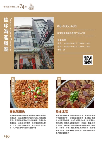 %u7c73%u7cd5%u70ba%u50b3%u7d71%u8fa6%u684c%u4e0d%u53ef%u6216%u7f3a%u7684%u7c73%u98df%u6599%u7406%uff0c%u70cf%u9b5a%u5b50%u66f4%u662f%u904e%u5e74%u904e%u7bc0%u5bb6%u5bb6%u6236%u6236%u4e00%u5b9a%u8981%u7aef%u4e0a%u684c%u7684%u98df%u6750%uff0c%u66f4%u51f8%u986f%u51fa%u81fa%u7063%u4eba%u523b%u82e6%u8010%u52de%u7684%u7cbe%u795e%u3002%u70cf%u9b5a%u5b50%u6ce1%u9152%u53bb%u5916%u76ae%u714e%u4e0a%u8272%u5207%u8584%u7247%uff0c%u7cef%u7c73%u84b8%u719f%u3001%u4e7e%u9b77%u9b5a%u53ca%u4e7e%u8766%u7c73%u6ce1%u767c%u3002%u7092%u849c%u982d%u3001%u4e7e%u8766%u7c73%u7092%u4e0a%u8272%u52a0%u5165%u4e09%u5c64%u8089%u7178%u4e0a%u8272%u52a0%u5165%u91ac%u6cb9%u7565%u7092%u5f8c%u52a0%u958b%u6c34%uff0c%u80e1%u6912%u7c89%u3001%u4e94%u9999%u7c89%u3001%u7802%u7cd6%u3001%u9b77%u9b5a%u716e%u6efe%u5f8c%u518d%u52a0%u9ed1%u9ebb%u6cb9%uff0c%u84b8%u719f%u7cef%u7c73%u6492%u4e0a%u849c%u982d%u3001%u6cb9%u8525%u9165%u5012%u5165%u7cef%u7c73%u62cc%u52fb%uff0c%u5373%u5fae%u4e00%u5230%u9999%u5473%u64b2%u9f3b%u7684%u50b3%u7d71%u5bb4%u5e2d%u83dc%u8272%u3002%u8702%u5de2%u8766%u7684%u6f14%u8b8a%u662f%u7531%u70b8%u5929%u5a66%u7f85%u7684%u6982%u5ff5%u62c6%u89e3%u3001%u91cd%u7d44%u518d%u5275%u9020%u800c%u4f86%uff0c%u900f%u904e%u5e2b%u5085%u6709%u6280%u5de7%u7684%u5747%u52fb%u6dcb%u4e0a%u6253%u6563%u7684%u9d28%u86cb%u6c41%uff0c%u86cb%u6c41%u7d93%u904e%u9ad8%u6eab%u6cb9%u70b8%u5f62%u6210%u8702%u5de2%u72c0%uff0c%u5728%u50b3%u7d71%u7684%u57fa%u790e%u4e4b%u4e0a%uff0c%u518d%u7531%u4e8c%u4ee3%u4e3b%u5eda%u5c07%u300c%u767d%u8766%u63db%u6210%u9ed1%u9baa%u9b5a%u8179%u8089%u300d%uff0c%u52a0%u4e0a%u5de7%u601d%u3001%u6539%u8b8a%u624b%u6cd5%uff0c%u9664%u4e86%u5916%u578b%u4ee4%u4eba%u5782%u6d8e%u5916%uff0c%u5165%u53e3%u6642%u66f4%u80fd%u5690%u5230%u5c64%u6b21%u53ca%u8c50%u5bcc%u53e3%u611f%u3002%u8702%u5de2%u9ed1%u9baa%u9b5a %u70cf%u91d1%u7c73%u7cd5 Jiazhen Seafood Restaurant%u62db%u724c/%u62ff%u624b%u83dc%u4e3b%u98df%u4f73%u73cd%u6d77%u7522%u9910%u5ef3%u7576 %u4ee3 %u81fa %u83dc %u9910 %u5ef3 %u5165 %u9078 %u9593 7408-8353499%u71df%u696d%u6642%u9593%u4f11%u5047%uff1a%u7121%u5047%u65e5%uff1a11:00~14:30 / 17:00~21:00%u5c4f%u6771%u7e23%u6771%u6e2f%u93ae%u5149%u5fa9%u8def%u4e8c%u6bb5 47 %u865f%u5e73%u65e5%uff1a11:00~14:30 / 17:00~21:00159