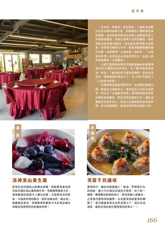 %u81fa%u7063%u83dc%u4e2d%uff0c%u8c6c%u7d5e%u8089%u642d%u914d%u8766%u4ec1%u3001%u677f%u6cb9%u3001%u8378%u85ba%u6454%u6253%u51fa%u7684%u8089%u9921%uff0c%u6700%u5c0f%u53ef%u4ee5%u505a%u51fa%u767e%u9053%u7684%u624b%u8def%u83dc%uff0c%u54ac%u4e0b%u7684%u4e00%u77ac%u9593%uff0c%u5634%u88e1%u7206%u51fa%u9bae%u751c%u7684%u8089%u6c41%uff0c%u5c07%u8001%u83dc%u878d%u5165%u65b0%u6982%u5ff5%uff0c%u6b63%u662f%u7576%u4ee3%u81fa%u7063%u83dc%u7684%u8da8%u52e2%uff0c%u5728%u8001%u81fa%u83dc%u8207%u65b0%u81fa%u83dc%u7684%u8f49%u8b8a%u4e0b%uff0c%u914d%u5408%u5065%u5eb7%u7f8e%u5473%u53ca%u81ea%u7136%u7f8e%u5b78%u4e4b%u4e0b%uff0c%u8a2d%u8a08%u51fa%u9019%u9053%u83dc%uff0c%u6700%u7d42%u5448%u73fe%u51fa%u7576%u4ee3%u81fa%u7063%u83dc%u7684%u7d93%u5178%u4e4b%u4e00%u3002%u63a1%u7528%u5728%u5730%u82b1%u84ee%u653e%u5c71%u98fc%u990a%u70cf%u9aa8%u96de%uff0c%u642d%u914d%u81fa%u6771%u7522%u6d1b%u795e%u82b1%u548c%u82b1%u84ee%u5728%u5730%u5c71%u85e5%u8207%u7da0%u7af9%u7b4d%uff0c%u7528%u6700%u7c21%u55ae%u71c9%u716e%u65b9%u5f0f%uff0c%u7f8e%u5473%u9178%u751c%u7684%u6e6f%u982d%u4ee4%u4eba%u96e3%u4ee5%u5fd8%u61f7%uff1b%u4e3b%u5eda%u79c9%u6301%u81ea%u7136%u539f%u5473%uff0c%u4e0d%u904e%u5ea6%u6599%u7406%u7684%u6982%u5ff5%uff0c%u5c07%u6240%u6709%u6700%u81ea%u7136%u3001%u6700%u5728%u5730%u3001%u6700%u5065%u5eb7%u7684%u98df%u6750%uff0c%u7528%u6700%u7c21%u55ae%u7684%u71c9%u716e%u65b9%u5f0f%u5448%u73fe%u51fa%u6700%u5728%u5730%u98a8%u4fd7%u6c11%u60c5%u8207%u7279%u8272%u7684%u98a8%u5473%u6599%u7406%u3002 %u591a%u5e74%u4f86%uff0c%u79d1%u5b78%u5bb6%u4e00%u76f4%u5728%u7814%u7a76%uff0c%u4eba%u985e%u98f2%u98df%u6d3b%u52d5%u4ee5%u53ca%u98df%u54c1%u696d%u7684%u5546%u696d%u884c%u70ba%uff0c%u5c0d%u74b0%u5883%u548c%u4eba%u9ad4%u5065%u5eb7%u9020%u6210%u7684%u554f%u984c%uff0c%u9019%u4e5f%u4fc3%u4f7f%u6c11%u773e%u4ee5%u53ca%u5f9e%u696d%u4eba%u54e1%u958b%u59cb%u601d%u7d22%u4eba%u8207%u98df%u7269%u7684%u95dc%u4fc2%u3001%u98df%u7269%u751f%u7522%u8207%u5927%u81ea%u7136%u7684%u95dc%u4fc2%uff0c%u56e0%u800c%u767c%u5c55%u51fa%u65b0%u7684%u98f2%u98df%u89c0%u5ff5%u3002%u800c%u4f4d%u8655%u65bc%u81fa%u7063%u6771%u5cb8%u7684%u8c50%u6ff1%uff0c%u9762%u5c0d%u8457%u6d69%u701a%u7684%u592a%u5e73%u6d0b%uff0c%u9130%u9760%u8457%u758a%u758a%u5c64%u5c64%u7684%u6d77%u5cb8%u5c71%u8108%uff0c%u6709%u8457%u81fa%u7063%u300c%u5c71%u6d77%u8d70%u5eca%u300d%u7684%u7f8e%u540d%uff0c%u300c%u5c71%u6d77%u5bb4%u65ec%u6599%u7406%u300d%u5e0c%u671b%u5728%u9019%u5c71%u6e05%u6d77%u79c0%u7684%u5730%u65b9%uff0c%u70ba%u65c5%u4eba%u63d0%u4f9b%u66f4%u512a%u8cea%u7684%u300c%u5c71%u6d77%u9957%u5bb4%u300d%u3002 %u4e3b%u5eda%u738b%u8056%u7fd4%u56e0%u70ba%u56ae%u5f80%u82b1%u84ee%u8c50%u6ff1%u64c1%u6709%u7684%u6771%u81fa%u7063%u6d77%u5cb8%u5f97%u5929%u7368%u539a%u7684%u81ea%u7136%u666f%u8272%uff0c%u82b1%u4e86%u6578%u5e74%u7684%u6642%u9593%u5b78%u7fd2%u3001%u7814%u7a76%uff0c%u4e86%u89e3%u5230%u5982%u4f55%u624d%u80fd%u53cb%u5584%u74b0%u5883%uff0c%u5805%u6301%u5728%u5730%u98df%u6750%u3001%u7bc0%u80fd%u6e1b%u78b3%u7684%u7406%u5ff5%u4e4b%u4e0b%uff0c%u5728 2018 %u5e74%u5275%u9020%u4e86%u300c%u5c71%u6d77%u5bb4%u65ec%u6599%u7406%u300d%u3002 %u82b1%u84ee%u8c50%u6ff1%u4f4d%u8655%u81fa%u7063%u6771%u534a%u90e8%uff0c%u6709%u8457%u6700%u9577%u9109%u93ae%u4e4b%u7a31%uff0c%u7269%u7522%u4e5f%u4ee5%u6d77%u9bae%u70ba%u4e3b%u3002%u7576%u5730%u5c45%u6c11%u53c8%u4ee5%u539f%u4f4f%u6c11%u5c45%u591a%uff0c%u6240%u4ee5%u5728%u300c%u5c71%u6d77%u5bb4%u65ec%u6599%u7406%u300d%u770b%u5230%u7684%u5c31%u662f%u7576%u5730%u98df%u6750%u8207%u7279%u8272%u7684%u806f%u7d50%uff0c%u5805%u6301%u4e92%u5229%u4e92%u60e0%u7684%u65b9%u5f0f%uff0c%u8b93%u5728%u5730%u8fb2%u6f01%u6c11%u6709%u66f4%u591a%u6536%u5165%uff0c%u540c%u6642%u53c8%u4ee5%u6700%u65b0%u9bae%u7684%u98df%u6750%u505a%u6599%u7406%uff0c%u4e26%u4e14%u628a%u6700%u5065%u5eb7%u3001%u6700%u7f8e%u5473%u7684%u6599%u7406%u5448%u73fe%u7d66%u5927%u5bb6%u3002%u6d1b%u795e%u6dee%u5c71%u990a%u751f%u96de %u8299%u84c9%u5e72%u8c9d%u7e61%u7403%u5b9c%u82b1%u6771%u6e6f%u624b%u8def%u83dc%u54c1166