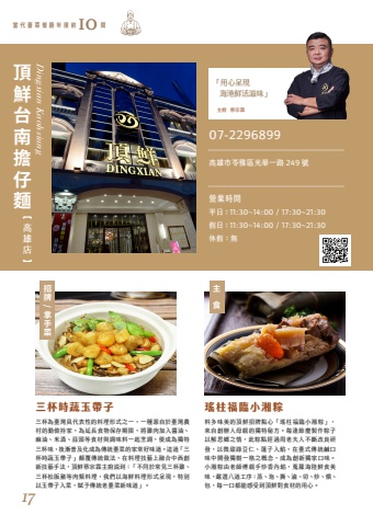 %u6599%u591a%u5473%u7f8e%u7684%u9802%u9bae%u62db%u724c%u9ede%u5fc3%u300c%u7464%u67f1%u798f%u81e8%u5c0f%u6e58%u7cbd%u300d%uff0c%u4f86%u81ea%u5275%u8fa6%u4eba%u6bcd%u89aa%u7684%u7368%u7279%u79d8%u65b9%u3002%u6bcf%u9022%u7bc0%u6176%u88fd%u4f5c%u7cbd%u5b50%u4ee5%u89e3%u601d%u9109%u4e4b%u60c5%uff0c%u6b64%u7cbd%u9ede%u7d93%u904e%u5468%u8001%u592b%u4eba%u4e0d%u65b7%u6539%u826f%u7814%u767c%uff0c%u4ee5%u5fae%u751c%u7da0%u8c46%u4ec1%u3001%u84ee%u5b50%u5165%u9921%uff0c%u5728%u81fa%u5f0f%u50b3%u7d71%u9e79%u53e3%u5473%u4e2d%u958b%u767c%u7368%u6a39%u4e00%u683c%u4e4b%u6982%u5ff5%uff0c%u6210%u70ba%u5275%u65b0%u7368%u5bb6%u53e3%u5473%u3002 %u5c0f%u6e58%u7cbd%u7531%u8001%u5e2b%u5085%u89aa%u624b%u7092%u9999%u5167%u9921%uff0c%u8490%u7f85%u6d77%u9678%u9bae%u98df%u7f8e%u5473%uff0c%u56b4%u9078%u516b%u9053%u5de5%u5e8f%uff1a%u84b8%u3001%u6ce1%u3001%u6495%u3001%u6ef7%u3001%u5207%u3001%u7092%u3001%u7168%u3001%u5305%uff0c%u6bcf%u4e00%u53e3%u90fd%u80fd%u611f%u53d7%u5230%u9802%u9bae%u5c0d%u98df%u6750%u7684%u7528%u5fc3%u3002%u4e09%u676f%u70ba%u81fa%u7063%u5177%u4ee3%u8868%u6027%u7684%u6599%u7406%u5f62%u5f0f%u4e4b%u4e00%uff0c%u4e00%u7a2e%u6e90%u81ea%u65bc%u81fa%u7063%u8fb2%u6751%u7684%u52e4%u5109%u6301%u5bb6%uff0c%u70ba%u5ef6%u9577%u98df%u7269%u4fdd%u5b58%u671f%u9650%uff0c%u5c07%u96de%u8089%u52a0%u5165%u91ac%u6cb9%u3001%u9ebb%u6cb9%u3001%u7c73%u9152%u3001%u849c%u982d%u7b49%u98df%u6750%u8207%u8abf%u5473%u6599%u4e00%u8d77%u70f9%u8abf%uff0c%u4fbf%u6210%u70ba%u7368%u7279%u4e09%u676f%u5473%uff0c%u5f8c%u6f38%u666e%u53ca%u5316%u6210%u70ba%u50b3%u7d71%u81fa%u83dc%u7684%u5bb6%u5e38%u597d%u5473%u9053%u3002%u9019%u9053%u300c%u4e09%u676f%u6642%u852c%u7389%u5e36%u5b50%u300d%u985b%u8986%u50b3%u7d71%u505a%u6cd5%uff0c%u5728%u6599%u7406%u6280%u85dd%u4e0a%u878d%u5408%u4e2d%u897f%u5275%u65b0%u6280%u85dd%u624b%u6cd5%uff0c%u9802%u9bae%u8521%u5b97%u9716%u4e3b%u5eda%u8aaa%u5230%uff1a%u300c%u4e0d%u540c%u65bc%u5e38%u898b%u4e09%u676f%u96de%u3001%u4e09%u676f%u677e%u962a%u8c6c%u7b49%u8089%u985e%u6599%u7406%uff0c%u6211%u5011%u4ee5%u6d77%u9bae%u6599%u7406%u5f62%u5f0f%u5448%u73fe%uff0c%u7279%u5225%u4ee5%u7389%u5e36%u5b50%u5165%u83dc%uff0c%u8ce6%u4e88%u50b3%u7d71%u8001%u81fa%u83dc%u65b0%u5473%u9053%u300d%u3002%u4e09%u676f%u6642%u852c%u7389%u5e36%u5b50 %u7464%u67f1%u798f%u81e8%u5c0f%u6e58%u7cbd Dingxian Kaohsiung%u62db%u724c/%u62ff%u624b%u83dc%u4e3b%u98df%u9802%u9bae%u53f0%u5357%u64d4%u4ed4%u9eb5%u7576 %u4ee3 %u81fa %u83dc %u9910 %u5ef3 %u5e74 %u5ea6 %u524d %u9593 10 %u3010%u9ad8%u96c4%u5e97%u301107-2296899%u71df%u696d%u6642%u9593%u5e73%u65e5%uff1a11:30~14:00 / 17:30~21:30%u4f11%u5047%uff1a%u7121%u5047%u65e5%uff1a11:30~14:00 / 17:30~21:30%u9ad8%u96c4%u5e02%u82d3%u96c5%u5340%u5149%u83ef%u4e00%u8def 249 %u865f17%u4e3b%u5eda %u8521%u5b97%u9716%u300c%u7528%u5fc3%u5448%u73fe %u6d77%u6e2f%u9bae%u6d3b%u6ecb%u5473%u300d