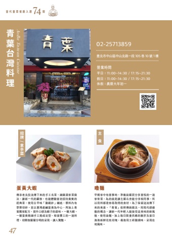 %u65e9%u671f%u5bb6%u4e2d%u6709%u559c%u4e8b%u6642%uff0c%u6e96%u5099%u7d66%u9130%u5c45%u5206%u4eab%u559c%u6085%u7684%u4e00%u9053%u5bb6%u5e38%u83dc%uff0c%u70ba%u7684%u5c31%u662f%u8b93%u5de6%u9130%u53f3%u820d%u80fd%u5206%u4eab%u76f8%u540c%u4e8b%uff0c%u6240%u4ee5%u7528%u6599%u90fd%u662f%u5bb9%u6613%u53d6%u5f97%u7684%u98df%u6750%u3002%u70ba%u4e86%u4fdd%u7559%u9019%u6d41%u50b3%u4e0b%u4f86%u7684%u7f8e%u610f%uff0c%u300c%u9752%u8449%u300d%u4f9d%u7167%u50b3%u7d71%u505a%u6cd5%uff0c%u7528%u73fe%u4ee3%u611f%u76db%u76e4%u7684%u6982%u5ff5%uff0c%u8b93%u65b0%u4e00%u4ee3%u5e74%u8f15%u4eba%u80fd%u63a5%u53d7%u9019%u7f8e%u5473%u7684%u65b0%u98a8%u8c8c%uff0c%u4f7f%u7528%u6cb9%u9eb5%uff0c%u52a0%u4e0a%u6bcf%u65e5%u9650%u91cf%u4f9b%u61c9%u7684%u8c6c%u809d%u53ca%u7576%u65e5%u6f01%u6e2f%u65b0%u9bae%u82b1%u679d%u5207%u584a%uff0c%u6700%u5f8c%u7528%u5de5%u7814%u918b%u8abf%u5473%uff0c%u5448%u73fe%u5728%u5730%u98a8%u5473%u3002%u50b3%u627f%u8001%u5317%u6295%u6d41%u50b3%u4e0b%u4f86%u7684%u624b%u5de5%u540d%u83dc%uff0c%u7d30%u7dfb%u9152%u5bb6%u83dc%u505a%u6cd5%uff0c%u8b93%u65b0%u4e00%u4ee3%u7684%u9867%u5ba2%uff0c%u4e5f%u80fd%u9ad4%u9a57%u7576%u521d%u62db%u5f85%u8cb4%u8cd3%u7684%u7d93%u5178%u83dc%uff0c%u4f7f%u7528%u53e4%u65e9%u5473%u300c%u8c6c%u7db2%u7d17%u300d%u92ea%u5e95%uff0c%u6f3f%u6599%u5167%u6709%u8378%u85ba%u5207%u788e%uff0c%u4e26%u4ee5%u81fa%u7063%u7522%u9e79%u86cb%u9ec3%u70ba%u4e2d%u5fc3%uff0c%u518d%u52a0%u4e0a%u9752%u8449%u7368%u5bb6%u914d%u65b9%uff0c%u63d0%u5347%u53e3%u611f%u53ca%u8766%u5b50%u7684%u751c%u5473%u3002%u4e00%u5c64%u5927%u8766%uff0c%u4e00%u5c64%u86cb%u9ec3%u7cbe%u7d30%u624b%u5de5%u6372%u6210%u5b9a%u578b%uff0c%u76f8%u7576%u8cbb%u5de5%u7684%u4e00%u9053%u6599%u7406%uff0c%u5207%u958b%u5f8c%u5c64%u5c64%u5206%u660e%u7684%u5448%u73fe%uff0c%u8b93%u4eba%u9a5a%u8c54%u3002%u86cb%u9ec3%u5927%u8766 %u5695%u9eb5 AoBa Taiwan Cuisine%u62db%u724c/%u62ff%u624b%u83dc%u4e3b%u98df%u9752%u8449%u53f0%u7063%u6599%u7406%u7576 %u4ee3 %u81fa %u83dc %u9910 %u5ef3 %u5165 %u9078 %u959302-25713859%u71df%u696d%u6642%u9593%u5e73%u65e5%uff1a11:00~14:30 / 17:15~21:30%u4f11%u5047%uff1a%u8fb2%u66c6%u5927%u5e74%u521d%u4e00%u5047%u65e5%uff1a11:00~14:30 / 17:15~21:30%u81fa%u5317%u5e02%u4e2d%u5c71%u5340%u4e2d%u5c71%u5317%u8def%u4e00%u6bb5 105 %u5df7 10 %u865f 1 %u6a137447