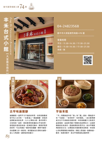 %u300c%u828b%u300d%u8207%u95a9%u5357%u8a9e%u4e2d%u7684%u300c%u8def%u300d%u548c%u300c%u8b77%u300d%u8ae7%u97f3%uff0c%u95a9%u5357%u8a9e%u4e2d%u6709%u4e00%u53e5%u8afa%u8a9e%uff1a%u300c%u98df%u7c73%u7c89%u828b%uff0c%u6709%u597d%u982d%u8def%u300d%u3002%u7d50%u5408%u81fa%u7063%u8fa6%u684c%u6587%u5316%u4e0d%u53ef%u6216%u7f3a%u7684%u4f73%u991a%u7c73%u7cd5%uff0c%u7c73%u7c92%u5438%u98fd%u91ac%u6c41%u4e4b%u5f8c%u662f%u5426%u6676%u7469%u5254%u900f%uff0c%u9019%u9053%u83dc%u8003%u9a57%u4e86%u5c0d%u7cef%u7c73%u7684%u8a6e%u91cb%u529f%u529b%u3002%u4ee5%u65b0%u9bae%u50b3%u7d71%u7684%u5728%u5730%u98df%u6750%u3001%u900f%u904e%u7d14%u6a38%u7684%u6599%u7406%u624b%u6cd5%uff0c%u7d50%u5408%u65e9%u671f%u81fa%u7063%u7684%u98f2%u98df%u6587%u5316%u3002%u4ee5%u50b3%u7d71%u7684%u6728%u6876%u5c07%u7cef%u7c73%u84b8%u719f%u5f8c%uff0c%u7c73%u7c92%u8edfQ %u597d%u5403%u5e36%u5fae%u5fae%u7684%u6728%u6876%u9999%u6c23%uff01%u642d%u914d%u4e0a%u9999%u83c7%u7d72%u3001%u5f8c%u817f%u8089%u7d72%u3001%u8766%u7c73%u3001%u4e7e%u8525%u4f86%u88fd%u4f5c%uff0c%u662f%u53e4%u65e9%u5473%u8fa6%u684c%u7684%u5fc5%u5099%u6599%u7406%u3002%u6ef7%u8c6c%u8173%u662f%u4e00%u9053%u518d%u5e73%u51e1%u4e0d%u904e%u7684%u5bb6%u5e38%u83dc%uff0c%u6709%u7279%u5225%u7bc0%u6176%u6216%u5bb6%u4e2d%u6709%u4eba%u751f%u65e5%u6642%uff0c%u4e00%u5b9a%u6703%u6ef7%u4e0a%u4e00%u934b%u6ef7%u8c6c%u8173%uff0c%u9999%u6c23%u56db%u6ea2%u642d%u914d%u6cb9%u4eae%u7684%u8272%u6fa4%uff0c%u5165%u53e3 Q %u5f48%u7684%u53e3%u611f%uff0c%u81fa%u5f0f%u6599%u7406%u5341%u5206%u5bb6%u5e38%u7684%u4e00%u9053%u83dc%uff0c%u770b%u4f3c%u7c21%u55ae%u8207%u666e%u904d%u7684%u53e4%u65e9%u5473%u6599%u7406%uff0c%u537b%u662f%u860a%u542b%u8457%u5bb6%u7684%u5473%u9053%u3002%u7d93%u5178%u81fa%u5f0f%u98a8%u5473%uff0c%u7c21%u55ae%u597d%u53d6%u5f97%u7684%u6750%u6599%uff0c%u53ef%u4ee5%u70f9%u8abf%u51fa%u4e00%u934b%u597d%u5473%u7684%u8c6c%u8173%uff0c%u7c21%u55ae%u4e0d%u9ebb%u7169%uff0c%u6c92%u6709%u7e41%u96dc%u5de5%u5e8f%u4e00%u6a23%u597d%u5403%uff0c%u4f7f%u7528%u91ac%u6cb9%u53ca%u4e94%u9999%u7c89%u53bb%u6ef7%u88fd%uff0c%u52a0%u5165%u516b%u89d2%u63d0%u9999%uff0c%u8b93%u9999%u6c23%u66f4%u6709%u5c64%u6b21%u3002%u53e4%u65e9%u5473%u6ef7%u8c6c%u8173 %u828b%u7d72%u7c73%u7cd5 Feng He Taiwanese Restaurant%u62db%u724c/%u62ff%u624b%u83dc%u4e3b%u98df%u4e30%u79be%u53f0%u5f0f%u5c0f%u9928%u7576 %u4ee3 %u81fa %u83dc %u9910 %u5ef3 %u5165 %u9078 %u959304-24823568%u71df%u696d%u6642%u9593%u5e73%u65e5%uff1a11:30~14:30 / 17:30~21:30%u4f11%u5047%uff1a%u7121%u5047%u65e5%uff1a11:30~14:30 / 17:30~21:30%u81fa%u4e2d%u5e02%u5927%u91cc%u5340%u5fb7%u82b3%u5357%u8def 476 %u865f74%u3010%u5927%u91cc%u5fb7%u82b3%u5357%u5e97%u301185